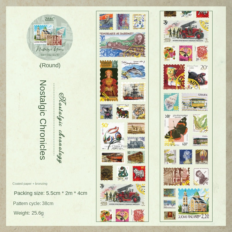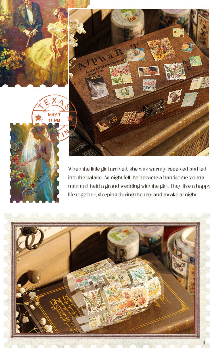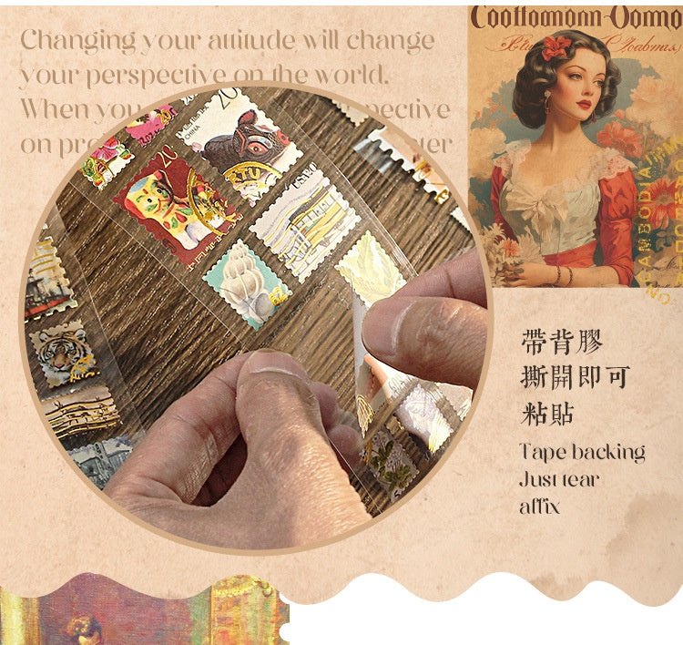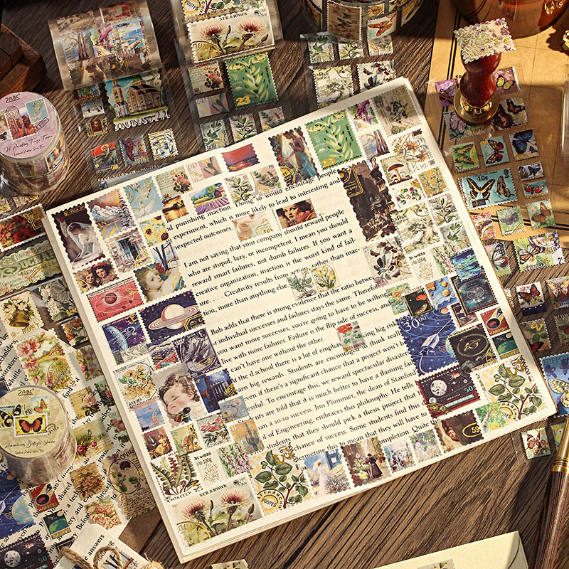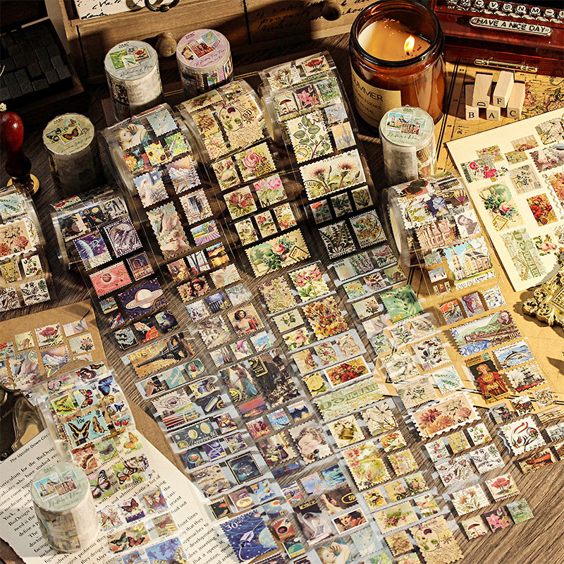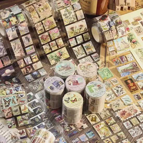 Yellowed letter paper, retro gold-stamped washi tape for DIY scene-making in bullet journals, bullet journal sticker rolls, plant and animal stickers, retro postage stamps.