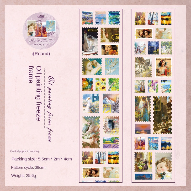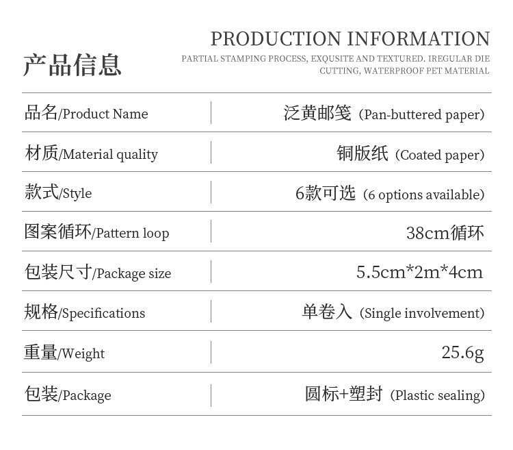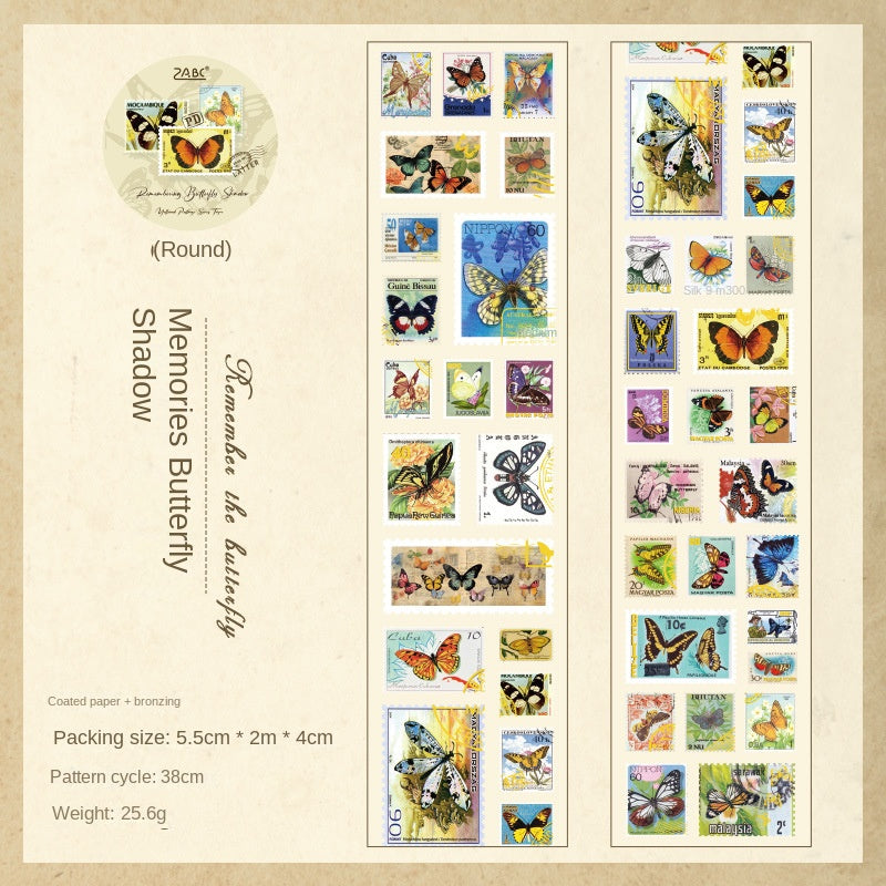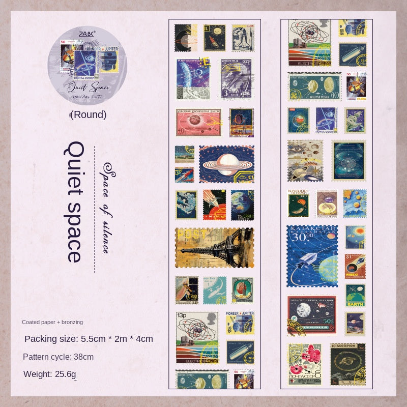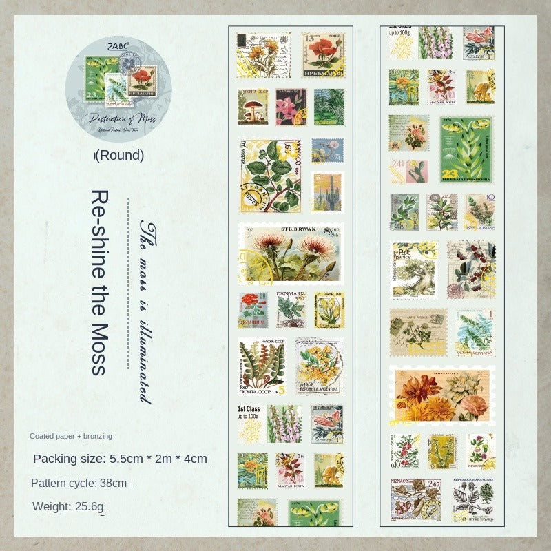 Yellowed letter paper, retro gold-stamped washi tape for DIY scene-making in bullet journals, bullet journal sticker rolls, plant and animal stickers, retro postage stamps.